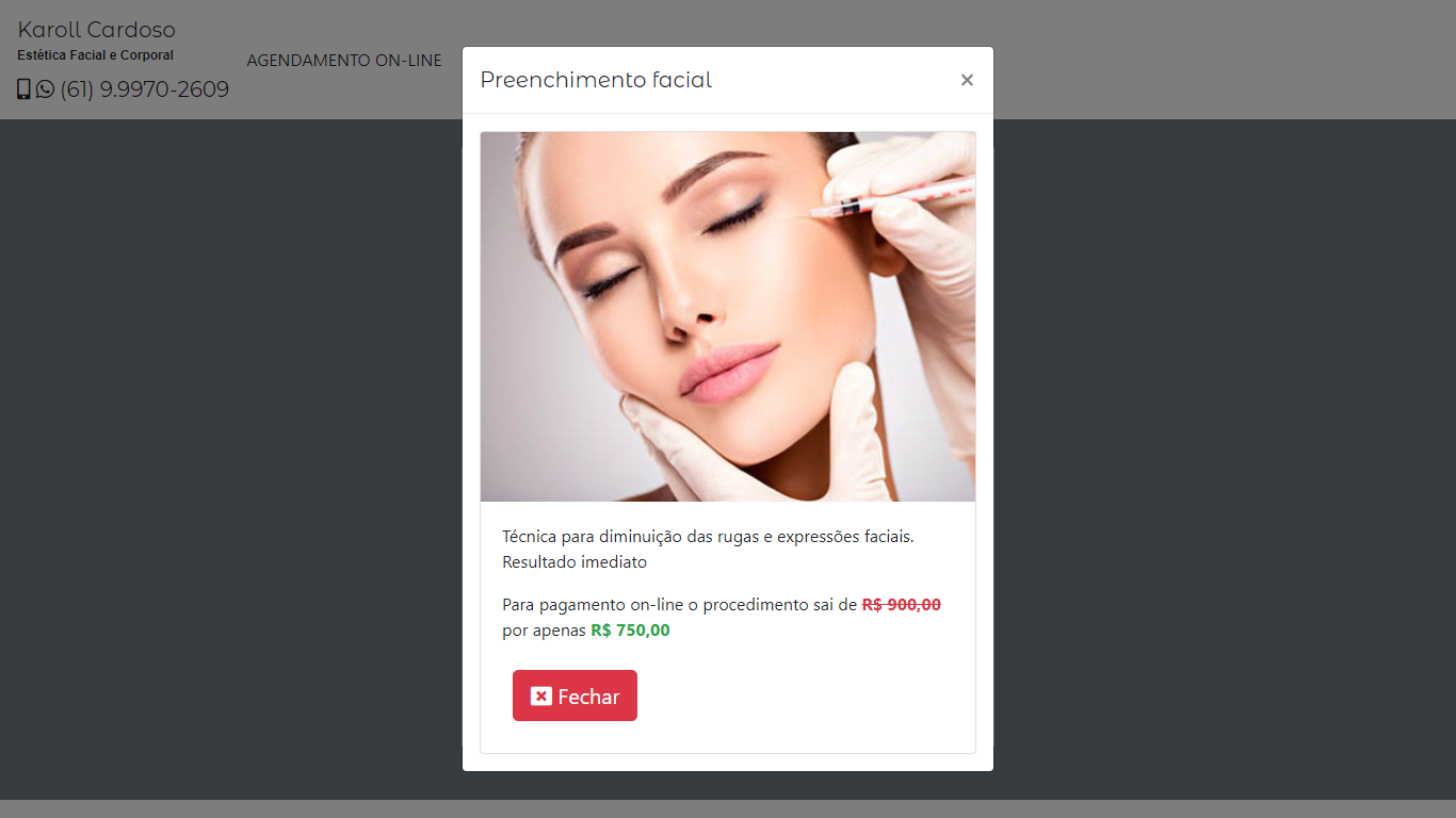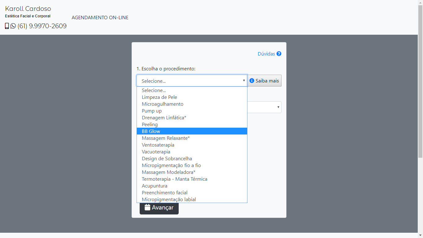 Na caixa de seleção de procedimentos, você escolhe o que deseja de tratamento e ainda pode conferir mais detalhes da sua escolha como